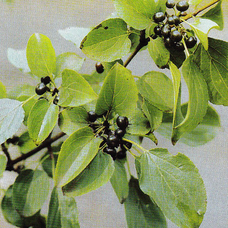 Buckthorn is a dioecious shrub or tree that grows up to 3 m tall, with upright branches bearing sparsely arranged, almost opposite twigs. The twigs usually end in thorns (buckthorns). The leaves are obliquely opposite, elliptical to round, with arched veins. The flowers are yellowish-green, small, and inconspicuous, growing in clusters at the leaf axils. In autumn, these develop into pea-sized black drupes (incorrectly called “berries”) containing up to four stone kernels (hard-shelled seeds). At the apex of the drupes, there are furrows crossing at right angles. The flowering season is from May to June.