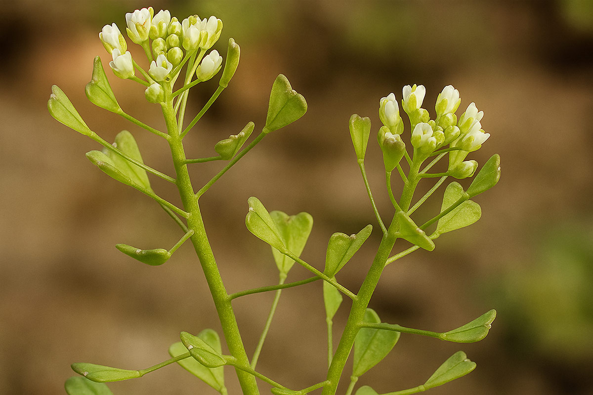Shepherd's purse is an annual herb that grows up to 80 cm tall. The stem – usually single, sometimes branched – grows from a basal rosette of leaves with entire margins. The few stem leaves are sessile, lanceolate, and broadly auriculate, clasping the stem. The small, white, cruciform flowers have long stalks. After fertilization, the plant develops its characteristic inverted, heart-shaped, triangular siliques (shepherd's purses). Since there are varieties that germinate in both spring and fall, flowering plants can be found from January to October.
